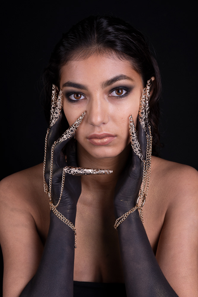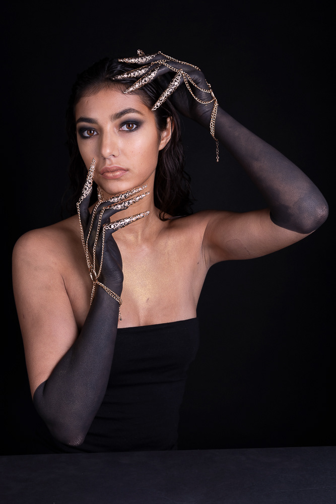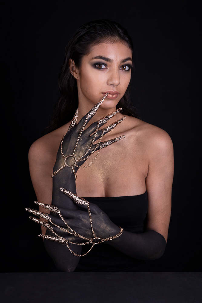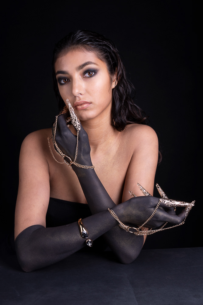 Boody painting des mains accompagné de bijoux sous forme de griffes dorées.
